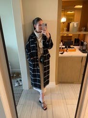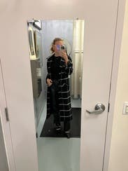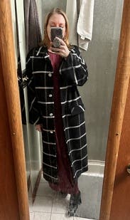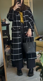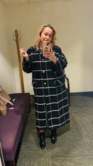 I’m still getting used to this whole oversized trend this fall/winter and honestly sometimes I just feel overwhelmed as a petite person. This coat wasn’t awful though. I kind of liked it, but I did have to go all the way down to an XS. It’s not super structured. Definitely a duster and more of a flowy look. I wore it with a long dress to my daughters’ dance recital. It was warm enough for the chilly evening but probably wouldn’t have been warm enough on its own for a very cold day. I’ll keep for a bit, but not sure I’d love enough to buy.