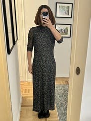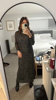 Loved this dress! Fun sleeves, flattering as my bump grew and liked the length. A little sheer between thighs and kind of high slit in the back, but loved it and wore to work.