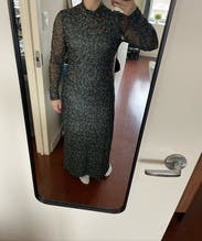 Very flattering and comfortable dress that fit true to size. I loved the sheer sleeves, but beware that the core of the dress is a little more sheer than I would've liked. It's double layered in the core, but you may need a slip underneath