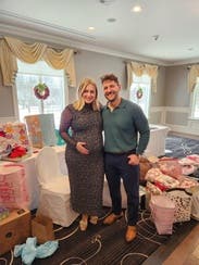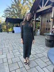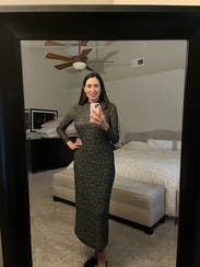 Loved this dress for my Christmassy baby shower. The pattern is very pretty and subtle. I ordered a size up from my pre-pregnancy size. I probably could have gotten away with my normal pre-pregnancy size (Size 12) but was grateful for the extra room once I realized the dress was slightly sheer. Comfortable fabric, great length, and easy on the bump. Would 100% recommend and would rent again after pregnancy.