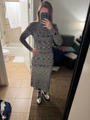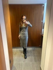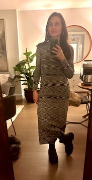 Will be renting again next winter! This dress is a perfect catch all. Easily could dress up for a night out or down more casual for work. The fabric is super comfortable and thick, hides everything and just feels amazing. I didn’t want to take it off, It felt like I was wearing pajamas (in the best way). True to size!