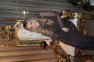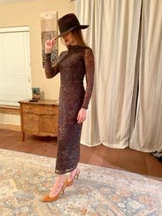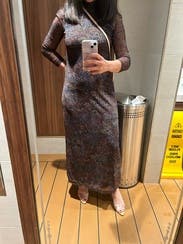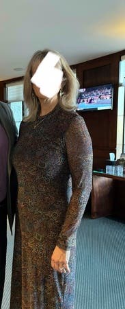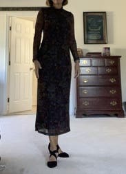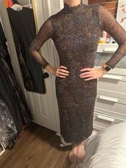 loved this dress. the high neck, the sheer sleeves and slit in the back made me feel really sexy. pattern and color is perfect for the colder months