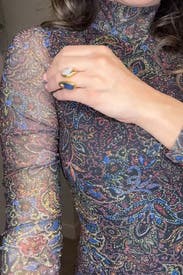 This Rosetta Getty Collective dress features a high neck and long sleeves with a paisley-like pattern, offering an elegant yet bold statement. Pair it with minimalist accessories and strappy heels to let the intricate design take center stage.