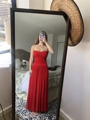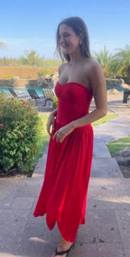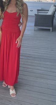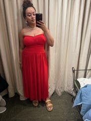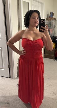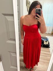I adored this red drop waist dress!! The drop waist is so on trend and the red is so vibrant and fun. This fit like a glove. I did wear shape wear to help smooth my tummy but the ruching is so flatter. I didn’t wear and a bra and it was so comfortable and stayed up all night. I’m 5’7” and thought this was the perfect length. Rent this!