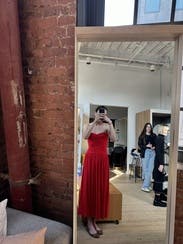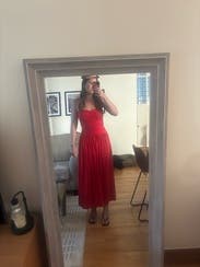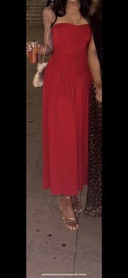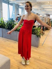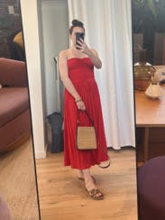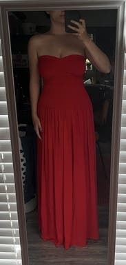 This vibrant red strapless dress by Rosetta Getty Collective epitomizes elegance with its ruched bodice and flowing skirt. Perfect for making a statement at any event, pair it with gold jewelry and neutral heels to complete the look.
