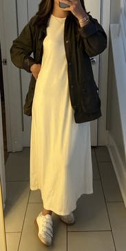 I missed this dress as soon as I shipped it back! Wore with flats and an over sized bag, both in black. Dress skims beautifully over curves, length was maxi but not overwhelming. Decided I needed to buy this so I can pair with Campus boots and a denim jacket, velvet booties and a moto jacket, a pullover crew neck sweater and Doc Marten Maryjane’s…