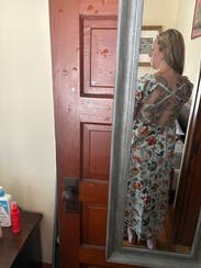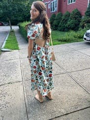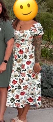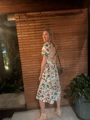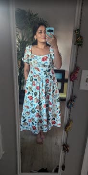 This semi formal floral patterned dress was perfect for a summer wedding. Heavy weight fabric was thick enough to go bra-less and the back details were so pretty. Loved this one! I sized up after reading the reviews and probably didn’t need to. This feels true to size.