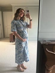 Wore this with a 26 week baby bump. I tried to size up but it wasn’t as loose as I had hoped. Still loved it and wore it multiple times