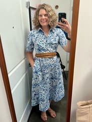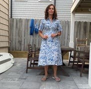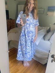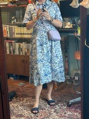 I wore this to an outdoor art walk (80s temps 🌞), the farmers market 🥬, and for a day in the country with family🏞️. It was great for each occasion for a few reasons: 1) you can dress it up or down. I wore it here with a hat and birks. I dressed it up with pearls and espadrilles. 2) pockets, good length to keep you comfortable and cool, perfect sleeve length for warm weather. 3) Pattern was a beautiful tropical botanical print that was funkier than traditional blue and white - the blue was almost a tie-dye or ink stain style with tots of texture and variation. It was really beautiful! 4) Fit is flattering yet conservative. The bust actually had enough room that I didn’t have to pin it. The waist was TTS and the hips were free. I’m glad I went with a 2 rather than a 0. It fit perfectly without being restrictive. Rosetta Getty is becoming a favourite of mine. This was so flattering and comfortable. I’ll absolutely rent again.