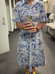 This dress speaks for itself. Simple jewelry and a wedge sandal and you are set for a meeting, brunch or day with friends. Size was perfect. Had to iron it before wearing it, but that just made me appreciate the print even more.
