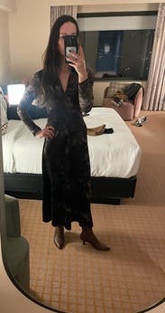 This dress is so comfortable and I had compliments all event as people stroked my arm to feel the material. Wore kitten ankle booties for a polished look that felt like loungewear.