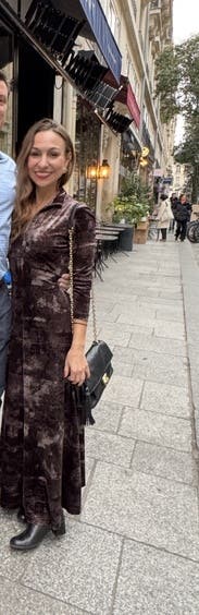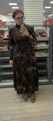 Got lots of compliments from this dress! Love that the neckline can zip to a turtleneck style or be a bit lower. I wore it lower as went out with the hubby! Really soft velvet fabric, and the dress fit perfectly. Not too clingy. It was a flattering dress. Paired it with some fun earrings and a pair of Isabel marant boots! Keeping it for a bit longer in hopes to wear it one more time!