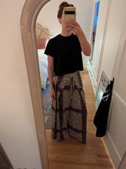 Great pants, print was fun for a hot fall day, the slit opens up quite a bit when you sit but that’s easy to be mindful of!