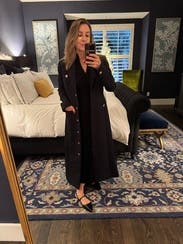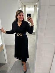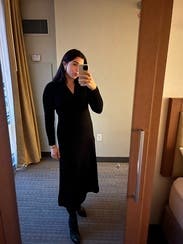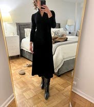 Somehow this dress can be casual and more formal depending on the shoes and accessories. It’s incredibly comfortable and stretchy, but hugs just right. The length is long even on my 5’7” frame, so I wouldn’t rent it if you’re much shorter than that unless you’re wearing heels. It’s warm, too.