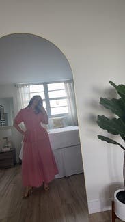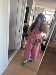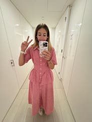 Loved this dress and its shape. It has pockets too! A bit long for me (I’m 5’4”) and the buttons weren’t the easiest. But I would rent again!