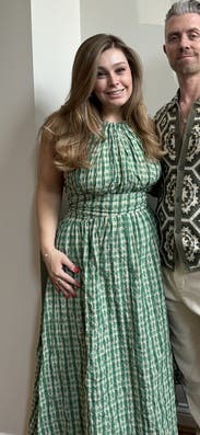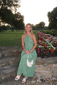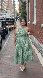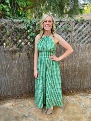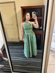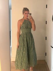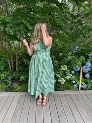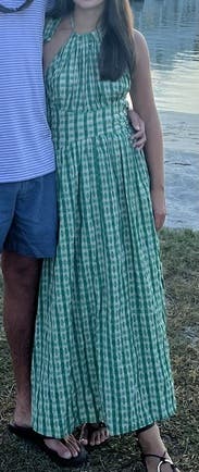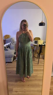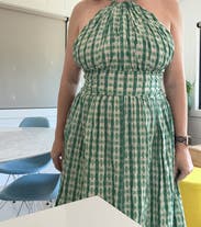 This dress is so pretty! The green/neutral check pattern is a perfect combo. Top is halter with a tie back, didn’t wear a bra. Tie on back stayed tied which is always a plus! Skirt zips up, no real stretch but for TTS. Skirt flows and has pockets! Great choice for any summer function :)