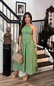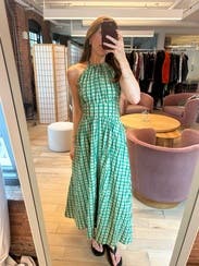 Rosie Assoulin’s “Halter in the Name of Love” dress delivers a playful twist on classic checks with its fresh green palette and flared silhouette. Pair it with strappy sandals and bold earrings for a standout summer look.