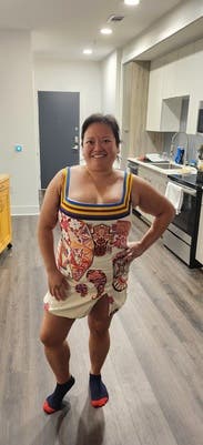 I absolutely loved wearing this dress! The design was so unique and colorful, and it really stood out in the best way. It was the perfect statement piece—fun, stylish, and one-of-a-kind. Highly recommend!
