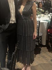 This dress has such a nice sparkly fabric and a great drape. I got a ton of complements and felt amazing in it! The tie in the back helps give a perfect fit. Since it has a low back, I wore it with adhesive bra cups, which worked perfectly.