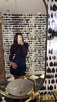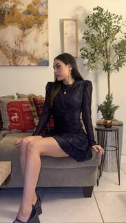 The shimmer in this dress made me feel like I was wearing the night sky and it was so much fun! There’s some really flattering ruching around the stomach area as well which kept it from showing any bumps, which was perfect. Would recommend this for a unique evening date look!