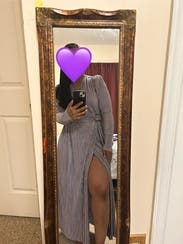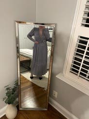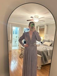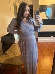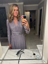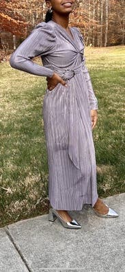 Really liked this dress. Very comfortable. Loved the long sleeves and the flow. The color is more of a purple/lilac than silver, but still pretty. I pinned the front so it wasn't so low. The back is open, so plan for that.