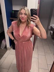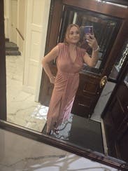 This dress is gorgeous! The shimmery pink fabric stands out in the sea of boring black. I wore the Large and it fit perfectly. I did use a Spanx body suit with the lower back so I could get a hold of my girls. I felt beautiful ❤️unfortunately I don't have a picture with full dress.