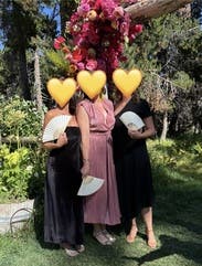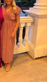 Wore this to a friend’s black tie optional wedding and it was beautiful! The color was very pretty and fun. I paired with silver heels and handbag, and pink statement earrings. The front is low cut, but it was just fine with some fabric tape. I got the size XS and S, and ended up going with the XS. It was a little snug in the waist but the back part had some stretch which helped. It just fit better up top with the smaller size, plus I’m only 5’3”. Great rental and highly recommend!