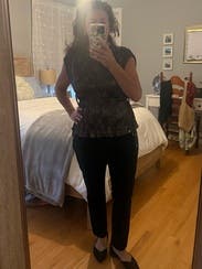 Liked this more than I thought I would! Lining in the bra area was strange and fit was a tiny bit awkward, but the waist was complimentary for hourglass shaped ladies. The style was equally great with dark slim jeans for a night out with the ladies and black dress pants for work. I’d wear more if I kept it longer. Versatile.