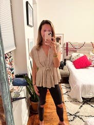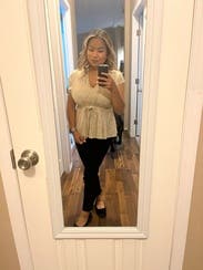 I really liked the way this shirt elevated simple bottoms. It took me a bit to finally put it on the I loved it. Semi deep cleavage for those of us with no significant “girls” to fill it.