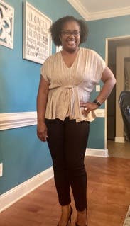 This is a nice empire waste shirt, it’s flowy. I wore this with a nice black cardigan and gold earring.