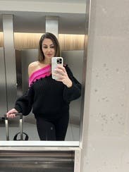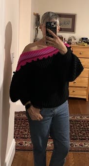 Fun, trendy sweater, I wore three times. When I didn’t wear a tank under it I had to safety pin the tag on the side bc it kept rubbing me. But, no big deal. Got lots of compliments.