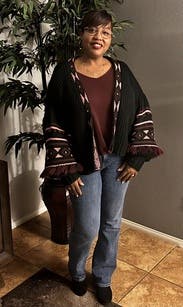 Great pattern and color on the sleeves. It upgrades an otherwise traditional black cardigan. Great elevated basic. Runs just a bit large.