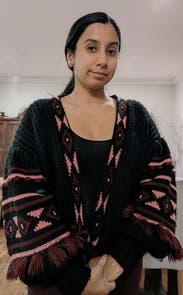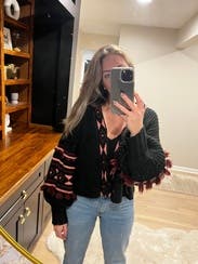 This sweater packs a big impact with large and tassels sleeves. Very fun!