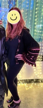 This sweater is fun and got lots of compliments. I would rent it again but in a smaller size. I went with the app recommendation and should have stuck with a size medium. The sleeves are very full so if you don't like that style, this is not for you.