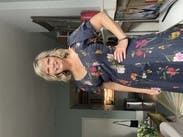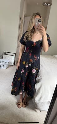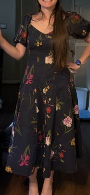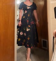 I'm absolutely obsessed with this dress! The floral pattern is stunning, and the navy background really makes the colors pop. The fit is perfect, and I love the short sleeves and flowy skirt. The material is comfortable and breathable, making it perfect for a night out or a special occasion. I've received so many compliments on it already, and I've only worn it once. The quality is top-notch, and I can tell it's well-made. I've been looking for a dress like this for ages, and I'm so glad I found it. Highly recommend!" 5/5 stars.