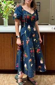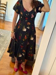I loved the vintage shape of this and how the variety of colors of flowers gave me so many options for shoes. I was worried based on other reviews that it would fall off my shoulders, but for me at least, it was a perfect fit from my shoulders through my chest (admittedly small, could see this being an issue for others) and in the waist). The fabric is just heavy enough not to risk a wardrobe malfunction in a swift wind, and I would say it's seasonally appropriate from early spring through late summer, depending on your climate.