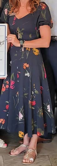 Wore this dress to a summer cocktail party, and got many compliments! It was comfortable to wear all night, and I loved the neckline and the midi-length. Went with the larger size to have more room in the chest area.