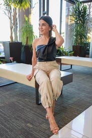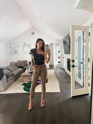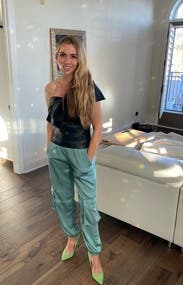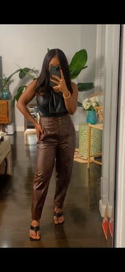 I wore this top with wide leg faux leather pants, a belt and platform boots to see a band. We danced all night and my outfit was a huge hit! Everyone thought it was a jumpsuit. It does get hot because faux leather doesn't breathe,