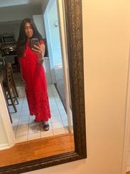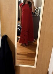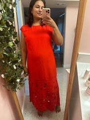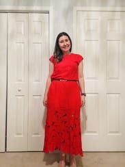 Comfortable red dress. I got a size bigger than usual to have space for my pregnant belly as it is not stretchy. A 12 might have worked just fine.