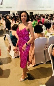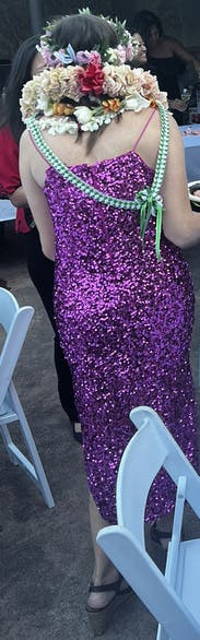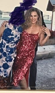 This dress is a head turner. I loved the sparkles and the slits on either side. I really wish it had adjustable straps - it’s really low cut if you have narrow shoulders and the thin straps are very difficult to pin.