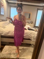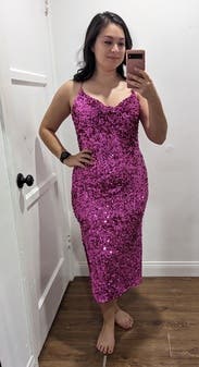 Wore this to Luann de Lesseps' Valentines cabaret show! Got my usual size, but dress was definitely looser than I wanted. I pinned the straps together so that the top didn't gape as much which was an easy fix (would get a size down though). Sequins were a little scratchy but its lined inside so that helped a lot!