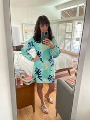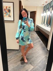 I loved the color and pattern of this dress. It was a perfect fit and style for my work tiki party event! I received so many compliments- it’s a stand out. It was a thicker, silkier material but it wasn’t too heavy and was perfect for the sunny afternoon and cooler night by the water. Renting again…might purchase. 🩵💙🐠