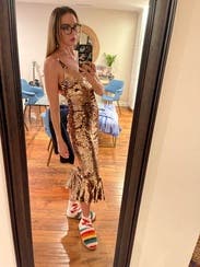Wore for NYE & loved it! It's more of a bronze than gold for accessory purposes. I went with black shoes. It is low cut & the straps aren't adjustable so plan accordingly. I didn't wear a bra & it's thick enough no sticky boobs either. Loved the weight & feel of it. I'm 5'10 135, 34d and wore a 4.