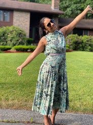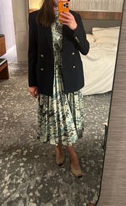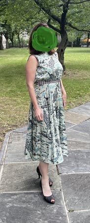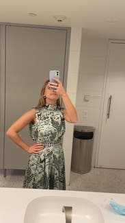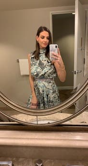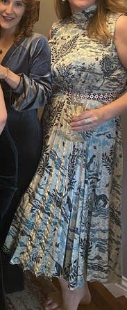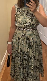This dress was everything I wanted in a wedding look - sophisticated, fun and flirty. The pattern was on trend and the colors were just right. A mock neck, sexy open back, with a pleated bottom - yes please! Received so many compliments. Felt comfortable and confident all night. I want to own this dress!