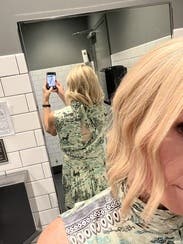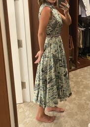 Lovely dress worn to a spring benefit party. Fabric is gorgeous. Love the pleats and the skirt length. The front is conservative and the back is sassy. I am a tried and true size 8 and ended up wearing the 6. I am 5’8” and have a long torso and this dress worked out.