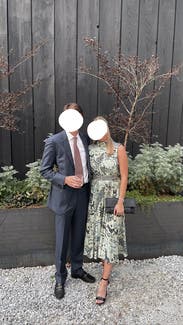 It was a perfect wedding guest dress. I'm only 5'1 so it was definitely way longer than intended but it still looked fine. The top is very blousy and open in the back so you can't wear a bra, but there's a little clip in the back if you want it closed in the middle. The zipper in the back ends right at your lower back so you also can't wear high shape wear. But it was comfortable all night. Probably my favorite rental I've gotten. If you're between sizes, definitely size down.