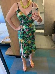 Wore this to a tropical theme night on a cruise. I fit right in. Fabric is thin and clingy. Slit isn’t too high and it had just enough ruffle.
