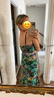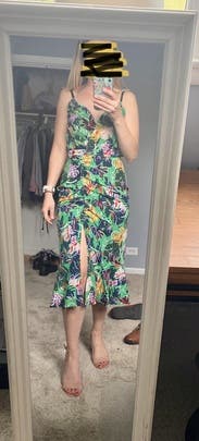 This dress was perfect for a warm weather evening casual/cocktail event. The fit around the hips was great, I have a smaller bust so the top was a tad loose and the straps are not adjustable. Theres a fun slit you can cinch to make either super high up or lower. Friends said my butt looked amazing :D Waist: 27.5" Hips: 39" Would 100% rent again
