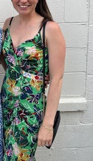 I love this trendy dress by SALONI! Running true to size with no stretch, I recommend wearing your true size for your primary size and going up for your back up. This style is fitted throughout the midsection and fitted at the hips. It works for cup sizes A-C. You are not able to wear a standard bra with this dress so you should wear nubra or no bra since there is a small bit of support for smaller cup sizes. At 5’4”, the length hit tea length on me. The pattern on the dress is vibrant and amazing in person. Pair with black or colorful heels and fun earrings to complete your outfit!
