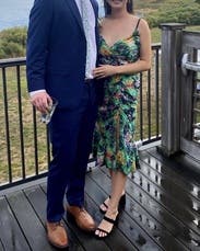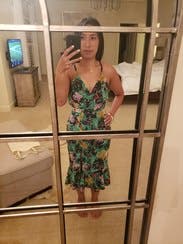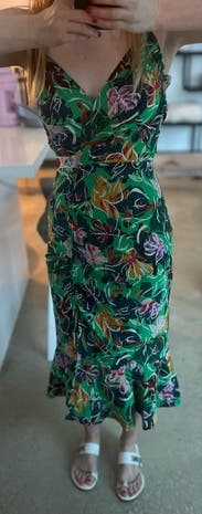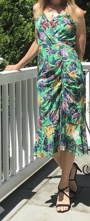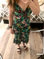 Love the fit and color and pattern of this dress. Very flattering. Felt like a Queen. Worn to outdoor dinner. Did not get full length picture.